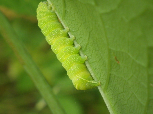 生駒の高山まで、夏に行う水鉄砲作りに使う竹の切り出しに同行。竹炭の会のみなさん、大変お世話になりありがとうございました。 お昼にイタドリの葉を覗いてみると数匹の緑色のイモムシがいた。カバキリガの幼虫と思ったが、じつはアオヤマキリガというのもいるらしい。ネットで調べてみるとどちらも同じような姿をしている。カバキリガの食餌植物はクヌギ、コナラ、サクラ、ハナミズキなどとあり、アオヤマキリガは広葉樹とある。イタドリはどうなんだ?カバorアオヤマキリガの幼虫というわけで、判別不能。またまたどなたかお教え下さればありがたいのですが。2014.05.23 生駒市高山町追:昨日お知らせしたねやがわ自然塾の受講生はまだ募集中です。にほんブログ村人気ブログランキングへ