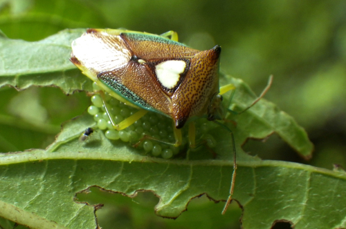 子育てするカメムシとして有名なエサキモンキツノカメムシですが、実際に卵を護っているところは見たことがなかった。木の名前は不明だが(たぶんヤシャブシかミズキ)、葉っぱの裏でたくさんのエサキモンキツノカメムシが卵を抱いていました。エメラルドグリーンの卵がお腹の下に見えます。しかし、よく見るとそばには小さなハエかハチのようなモノがいます。寄生のためにカメムシの卵を狙っているようです。カメムシはハエが近寄ってくると体を左右に振って追い払っていました。大切そうに卵を護るエサキモンキツノカメムシ2014.08.05 田原の里山にほんブログ村人気ブログランキングへ