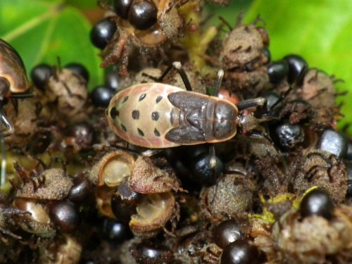 雨模様だったがポストに手紙を出しに行くついでに、近所を散歩。寝屋川公園のアカメガシワの実が黒く熟していた。何か動いているのでよく見てみると、カメムシの幼虫がいました。保護色なのか実と色合いがよく似ています。オオホシカメムシの幼虫のようです。同じような模様をしたものにヒメホシカメムシという種もいますが、そちらの方かもしれません。色合いが地味なのでここではオオホシカメムシの幼虫にしておきます。どちらもアカメガシワの実が好物だそうで、実の熟すいまの時季にはよく見かけるそうです。アカメガシワの実とオオホシカメムシの幼虫2014.08.28 寝屋川公園にほんブログ村人気ブログランキングへ