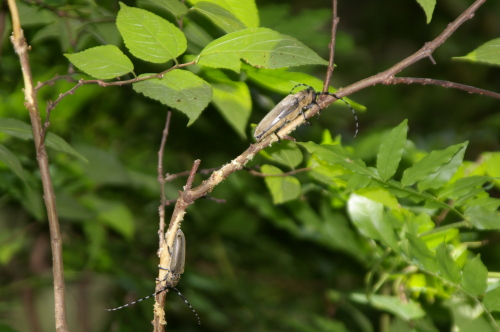 池の渕に生えている小さな木の枝を2匹のクワカミキリが食害していた。枝の表皮部分はほとんど食べられていまいた。2014.08.20 むろいけ園地にほんブログ村人気ブログランキングへ