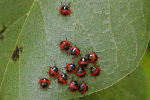むろいけ園地の駐車場にあるコブシの葉裏に赤い小さな虫が集団でついていました。ルビーのように輝くアカスジキンカメムシの幼虫(1齢)です。成虫も美麗種ですが、幼虫もきれいですね。2014.08.13 むろいけ園地にほんブログ村人気ブログランキングへ