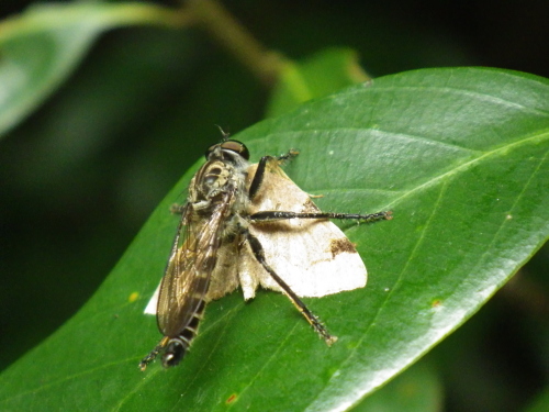 保津峡から清滝までの自然観察会、緑色の葉っぱの上にいたのは自分の体くらいある蛾を捕えていたムシヒキアブの一種。この小さな虫の狩りの能力はピカイチで、近くを飛ぶ獲物にビューンと襲いかかり、その鋭い口吻を突き立てて体液を吸い取ってしまう。それにしても、ムシヒキアブはどれも同じように見えて種を同定するのは難しいですね。2014.08.31 保津峡から清滝にほんブログ村人気ブログランキングへ