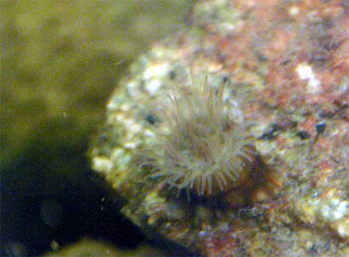 少し潮の引いた磯に行くと緑色の縦に縞模様のあるイソギンチャクが群生しているのをよく見かけます。写真のイソギンチャクは、この水槽に来て約5ヶ月になり、磯で見るあの独特の色と模様は薄くなってしまいましたがまだ生きてます。