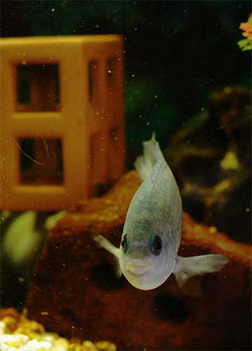 小さい頃は、頭の上が青く光ってきれいだったが、大きくなると写真のように何の変哲もないねずみ色のスズメダイになった。しかし気性が荒く、この水槽全体を縄張りにしてしまい、他の固体を入れることができなくなってしまった。