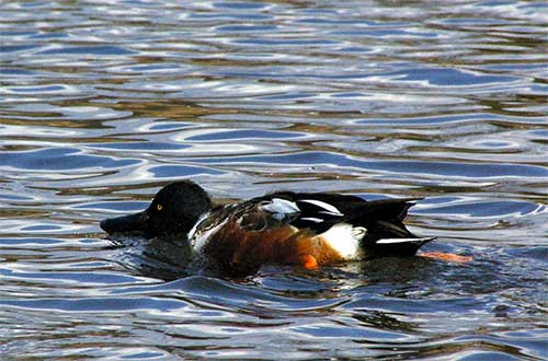 打上川緑地公園の池に鴨が増えてきました。コガモに混じってハシビロガモが2羽。水面を黒い嘴で掬いとるように、素早く突き進んでいきます。コガモとは違った動きです。