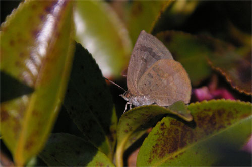 ムラサキシジミのようだ。アラカシを食草とする小さなシジミチョウ。翅の表は紫色をしているが、閉じていると枯葉のような地味な色なのでわからない。