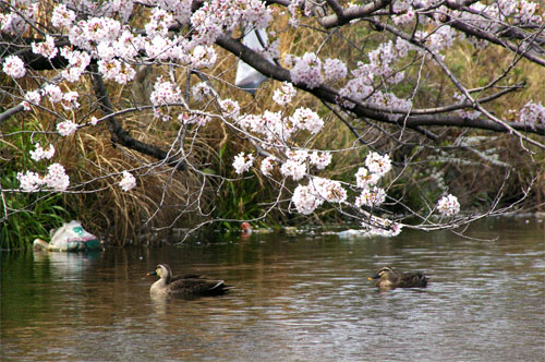いつもは、ごみが浮いて汚い池も、サクラでお化粧されてちょっとだけきれいに見えます。