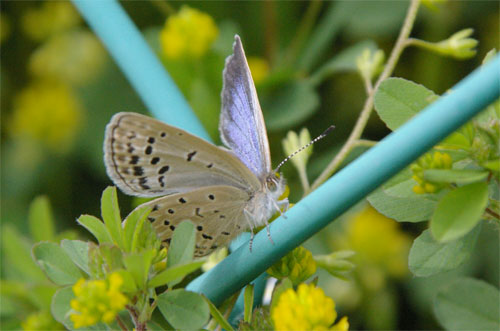 帰りに道路脇のコメツブツメクサの生えている空地の金網で小さな蝶を見つけた。ヤマトシジミだ。風に飛ばされまいとしがみついている。どこにでもいる蝶だが、今年初めてのヤマトシジミとの対面でした。