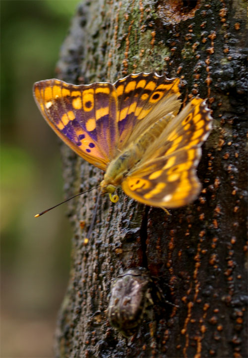 帰る途中の寝屋川公園の虫喰いの木には、いつものようにコガネムシとサトキマダラヒカゲがいた。その中にサトキマダラヒカゲとは模様の違う蝶が1頭。翅と眼と口吻と触覚の先が黄色だ。翅を広げると内側は紫色です。コムラサキのようです。食樹はヤナギ類。