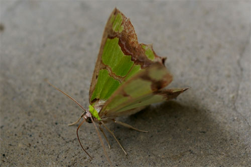 ベランダの植物に水をやったら、緑色の翅をもった蛾が吸水に来た。吸水中は蝶のように翅が閉じ気味です。カメラに収めて、調べてみるとアシブトチズモンアオシャクという蛾でした。 チズモンは翅の模様を地図に見立てて地図紋の意でしょうね。