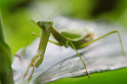 近頃、オオカマキリをよく見かけるようになった。たいていはおなかの大きなメスである。木の枝先や葉陰でカマを構えて、獲物を待ち構えている。