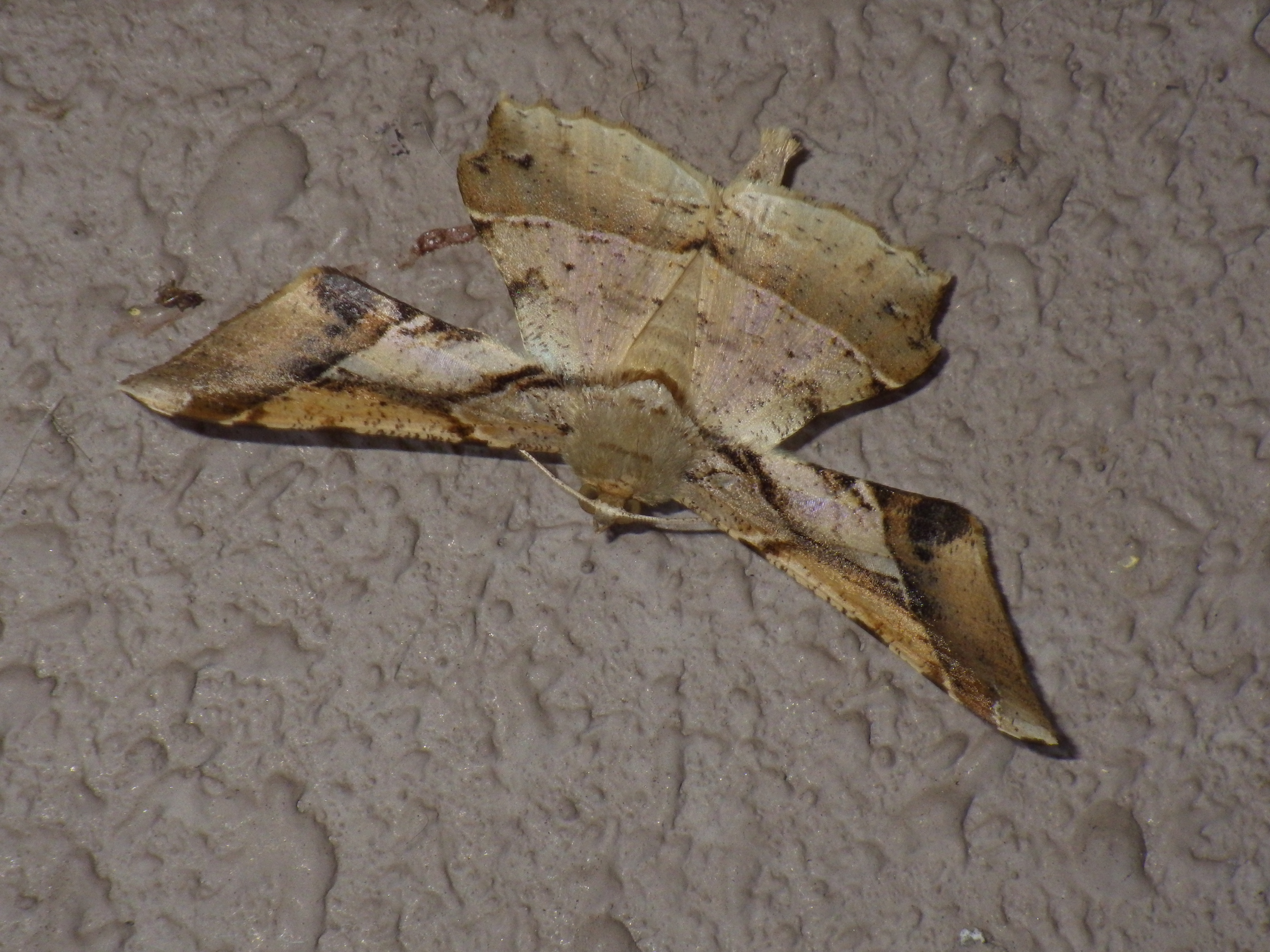 今度もマンションの階段に落ちていた蛾です。標本にされたように翅を拡げて落ちていました。ツマジロエダシャクです。そっと持ち上げましたが片方の触角が折れてしまいました。折角なので手帳の上に載せて撮影後、メディアのケースに収納した(自然を学ぶ会に持っていくかな)。生きてとまっているときはもう少し上翅を上げています。以前に取り上げたときは こんな形 でした。