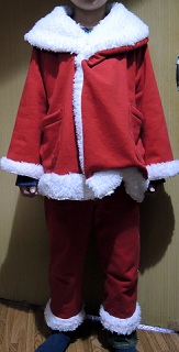サンタさんの衣装をつくりました。上:Hibi+さんのショールカラーコート 130下:Check & stripe standard [ CHECK&STRIPE ]キッズフランネルパジャマ 120白いボアを付けてアレンジ!下はニットにして丈を少々短くしています。写真にはないのですが、娘の要望で2着目も。徹夜しました。暖かいし、子どもたちも大喜びです。