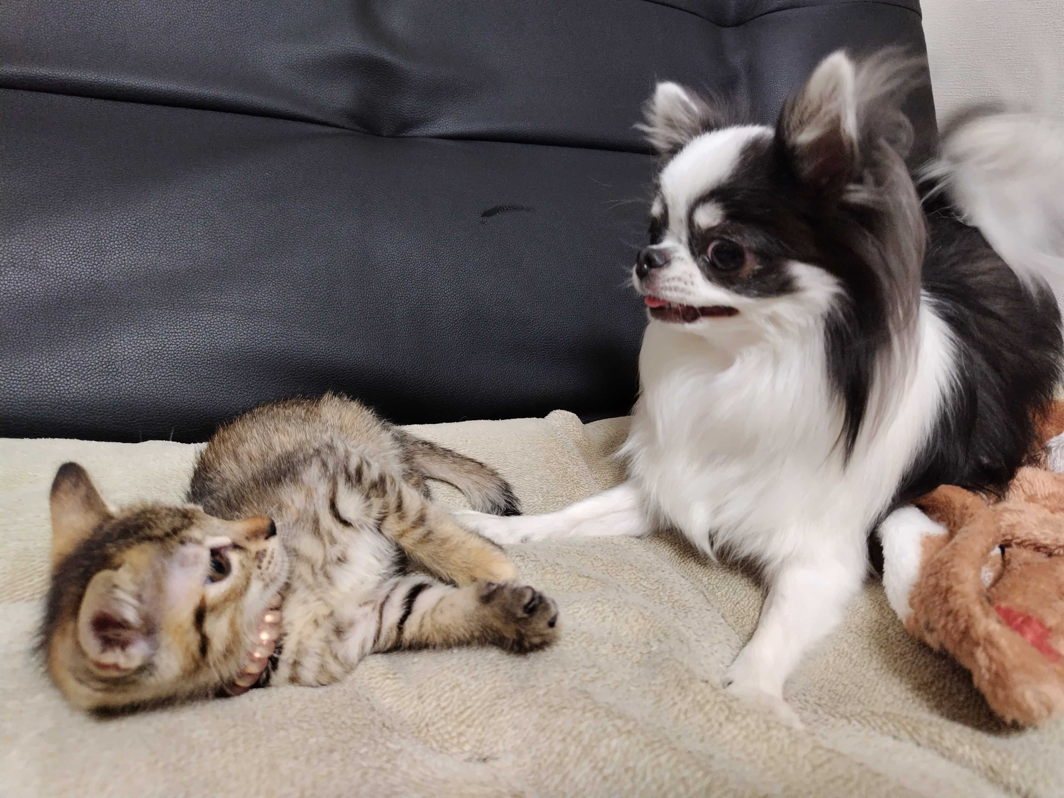 ワンコたちとの距離もかなり縮まり、猫ちゃん(女の子の方)が、おなかを見せてくれるようになったり😍