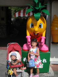 3日目今日も朝から日曜よりは月曜の方が水族館は空いているだろうと思い、美ら海水族館に行きました。季節が良いのか、混んでいて驚きました。勇輝はベビーカーに載せていたので、あまり人の多いところに行くとぶつかって迷惑になると思い、スペースが空くのを待って魚を勇輝にも見せてあげました。大きなジンベイザメもいて、見ごたえがありました。彩香はエイが好きで、大きなエイが泳いでくると喜んでいました施設内は公園になっていて1日遊べるぐらいでしたが、暑いのと人が多かったので別の場所に行くことにしました。また今度ゆっくり見たいなあ。水族館の近くにエメラルドビーチというビーチがあったのですが、綺麗なビーチでした。泊まったホテルから水族館までは1時間ちょっとでしたが、那覇からだと2時間はかかると思います。北部に1泊するのも良いなぁと思いました。お昼過ぎになってしまったのですが、ですこし行ったところにナゴパイナップルパークがあるので行ってきました。まずは、パイナップル号というカートに乗り、園内のパイナップル畑を見て回りました。その後はおみやげ物屋さんにつながっていて、ジュースやワイン、パイナップルが食べられるようになっていました。「食べ放題」となっているのですが、パイナップルはそんなに沢山食べられませんねぇ。パインジュースや、シークヮーサージュースなどを飲んだり、パイナップルをつかったお菓子でカステラやケーキなど色々食べたらお腹がいっぱいになってしまい、お昼代が浮きました何も買うつもりはなかったのですが、ワインとジュースを買いました。まんまと施設の思惑にはまってしまっています。。。で移動の間、勇輝はすぐに寝てしまうので楽でした。彩香も夜寝るのが遅かったので、よく寝ていましたホテルに帰ってきて4時過ぎていたのですが、彩香がプールか海に行きたいと言うのでプールで少し遊ぶことにしました。パパは長距離の運転で疲れたのか部屋で寝ていたので、彩香には勇輝を抱っこしてプールに入らなきゃいけないからワガママ言わないように言い聞かせて行きました。浮き輪で泳ぐのも慣れたのか、昨日は思った方向に進めなかったのに進めるようになっていました1時間ぐらいでプールから上がり、夜はホテルの近くの沖縄料理やさんに行きました。パパが会社の人から聞いたお勧めのお店だったのですが、個室でゆっくり食事が出来て良かったですお料理も美味しかったですよ。彩香は海ぶどうが気に入ったようで、喜んで食べていました。ぐるくんの唐揚げも出てきたのですが、美味しかったです。今日はパパと彩香が大浴場に行き、ママはその間にコインランドリーで洗濯をしました。2回洗濯機をまわし、その後乾燥もしたので終わったのは12時過ぎてしまいました。みんな寝てしまったので、ママは1人でお風呂に行き洗濯物を畳んでパパがスーツケースにしまいやすいように帰りの準備だけして寝ました。まだもっと沖縄にいたかったなぁ。。。