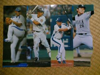 えーと、今日完成した傑作を4つ載せます。これはスポーツ店でおいてあるパンフレットを持ち帰り切り抜いたものです。左から松坂、関本、立浪、福原です。左から斎藤、浜中、福留、立浪です。上段、左から浜中、井口、上原、松井秀、イチロー。中段、左からイチロー、磯部、小笠原、松井秀、井端、浜中。下段、左からイチロー、荒木、安藤、三浦、渡辺俊。イチロー×5です。結構自信作です。
