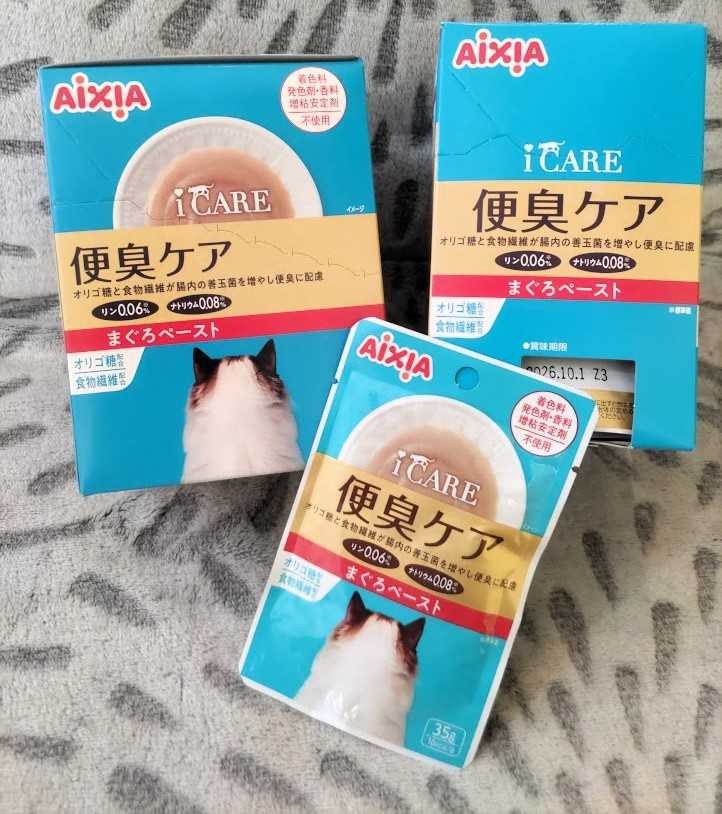 色々試したアイシアのi-CAREシリーズ今回の便臭ケアのお試しがicareシリーズのアンカーとなります実際のところ、うちの子たちは大体うんちタイム決まっているしウンチ部屋別やし出し終わったら「うんこたでー💩はよ掃除してやー」とでっかい声で喚くので直ぐにお掃除しちゃうので便臭はさほど気にならないのですがハナちゃんお気に入りのペーストフードと言う事でポチッとしておきました食い付きについては先の3種類に比べると少し悪いような気がしますハナちゃんはちょっとしか食べないけど残ったものはちび君がきれいに食べてくれるので今回も無駄にならなくお得なお試しでございましたアイシア iCARE 便臭ケア まぐろペースト 35g×★12個★ IC-9アイシア iCARE 水分補給 かつおペースト 35g×★12個★ IC-2iCARE 腎臓ケア まぐろペースト 35g×24個 アイシア ▼a ペット フード 猫 キャット ウェット レトルト パウチ フェカリス乳酸菌FK-23配合 アイケア AIXIAアイシア iCARE マルチビタミン まぐろペースト 35g×★12個★ IC-10