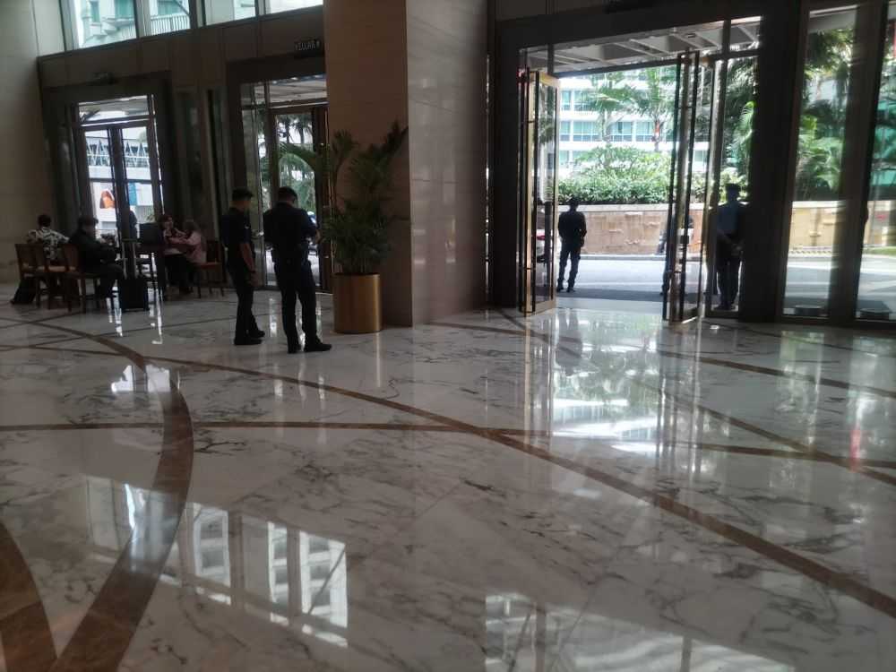 エントランス前及び中入ったところには沢山のスタッフとガードマンみたいな人が立ってます