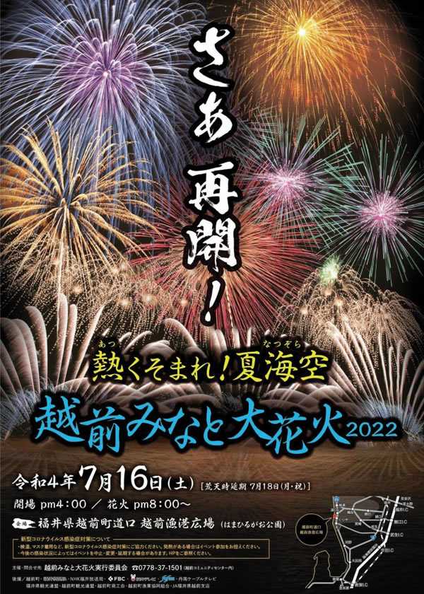 こんにちは、ふるさとの宿こばせです。ようやく3年ぶりに花火大会「越前みなと大花火」が開催されますよ~!千輪花火や水中花火など約10000発!越前漁港の夜空を彩ります。なんかうれしいです♪会場:福井県丹生郡越前町道口 越前漁港広場(はまひるがお公園)スケジュール:午後4時~プレオープン、午後8時~花火大会臨時駐車場からシャトルバスが運行されます。詳しくは実行員会HP等をご覧ください♪こばせHPが新しくなりました。しばらくは、こばせ旧HPもありますが、ぜひこばせ新HPもよろしくお願いいたします!-------------【おかげ様で150周年】-------------明治3年、塩湯治旅籠として創業以来、たくさんのお客様にご愛顧頂いております。越前海岸 ふるさとの宿こばせ 予約・お問合せ:0120-37-0018 〒916-0311 福井県丹生郡越前