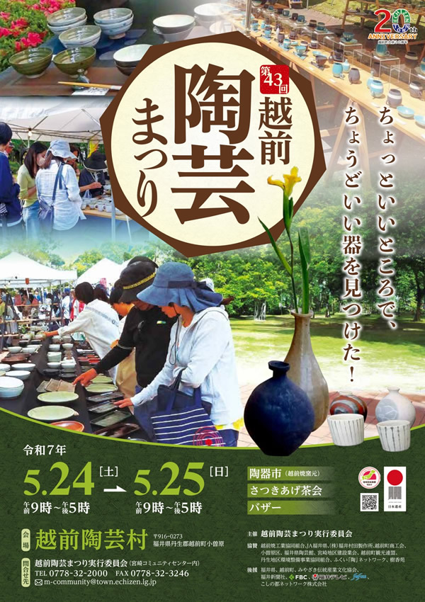 こんばんは、越前町ふるさとの宿こばせです。5月はたくさんイベントがあるので、どんどんご紹介しますね♪越前陶芸まつりは福井県内の越前焼蔵元が一堂に集結する、県内最大の陶器市です。会場では、飲食バザーや陶芸館茶園等でさつきあげ茶会などが開催されます。日時:2025/5/24(土)・5/25(日)9:00~17:00場所:越前陶芸村 福井県丹生郡越前町小曽原ちなみに、文化交流館では、「越前焼で珈琲時間」というCoinCafeで自分好みの素敵な器を選んで珈琲が飲めるんですよ♪-------------【おかげ様で150周年】-------------明治3年、塩湯治旅籠として創業以来、たくさんのお客様にご愛顧頂いております。越前海岸 ふるさとの宿こばせ 予約・お問合せ:0120-37-0018 〒916-0311 福井県丹生郡越前町梅浦58-8