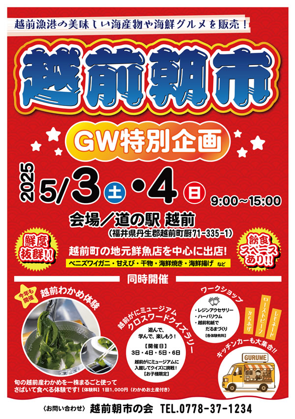 こんにちは、越前町ふるさとの宿こばせです。本日も、GWのイベント情報です♪明日、あさっての2日間、道の駅越前で、越前朝市が開催されます♪越前漁港の美味しい海産物や海鮮グルメの販売がありますよ~!GW特別企画の越前わかめ体験、いかがですか~?詳細は、えちぜん観光ナビHPをご覧ください。日時:2025/5/3(土)・5/4(日)9:00~15:00場所:道の駅越前 福井県丹生郡越前町厨71-335-1-------------【おかげ様で150周年】-------------明治3年、塩湯治旅籠として創業以来、たくさんのお客様にご愛顧頂いております。越前海岸 ふるさとの宿こばせ 予約・お問合せ:0120-37-0018 〒916-0311 福井県丹生郡越前町梅浦58-8