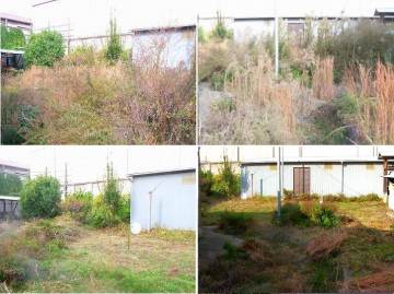 今日は、朝から、妻の実家の庭の草刈りに行った。妻がときどき行って刈っていたのだが、刈っても刈ってもすぐ伸びるので、追いつかない。そこで、今日は私が一緒に行ったのだ。10時前に到着して庭に入ったとたん、背丈より高く伸びた草にびっくり。さっそく刈ることにする。花粉が飛ぶので、マスクをし、服は草の種が付きにくいものを着る。昼ごろには大分きれいになった。しかし、急に慣れない動きをしたためか、腰が痛くなって動きにくくなった。持参した弁当で昼食とし、しばらく休憩したが、やはり腰が痛い。腰を曲げようとすると痛む。あとは、植木の選定が残っているが、今日はこれで終ることにした。写真は、草刈り前(上)と草刈リ後(下)の庭。 枯草を 刈つて見通し よくなりぬ今年は、どこでも、柿がよく生っているそうだが、庭の柿も鈴生り。熟した柿はハトかカラスにつつかれている。少し、収穫して持ち帰った。
