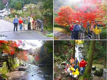 今日は、キッズプラザのパソコンボランティアで作るPIPクラブの秋のハイキングの日。天気予報では、数日前から雨が予想されていて。前日の予報でも、40~50%の降水確率。夜中には雷を伴う大雨となり、夜が明けてもまだ少し雨が残っていた。今朝の天気予報では、曇りときどき雨で降水確率はやはり40~50%と変らない。小雨決行ということなので、出かける準備をし、まだ小雨が降っている中を9時40分に家を出て、大阪10時発の新快速に乗る。車中で、仲間2人と一緒になる。高槻で降りると、既にもう一人が来ていて、待合わせの時間までに7人となった。10時45分発上の口行きのバスに乗る。雨はいつの間にか止んでいた。上の口終点で降り、道標に従って道を西に入るとなだらかな下りの道が続く。のどかなハイキングコース。雨上りの空気はすがすがしい。やがて別れ道に来、左折して摂津峡への道を取ると、すぐに、摂津峡大橋という名前の全長5メートルほどの橋を渡ることになる。しばらく行くと、紅葉のきれいなお寺が見える。慶住院という鬼子母神のお寺だ。このあたりで雲が晴れ太陽が顔を見せる。紅葉が映えて素晴らしい美しさだ。こんなにいい天気になるとはだれが予想したろう。仲間の一人がリュックに照る照る坊主をぶら下げている。そのお陰だそうだ。慶住院を出るといよいよ摂津峡の景観が始まる。左手に大小の奇岩のまじる渓谷と7分程度に色づいた紅葉に囲まれながらゆっくりと道を進む。サワガニを見つけて喜んだり、足を滑らせて転びそうになる仲間をからかいながら進むと、白滝への道が分かれている。本道から50メートルほど入ったところに滝はあった。高さは10メートル程度で小さいが前日からの雨で水量たっぷりの滝であった。迂回路と書かれた道を進むと、再び渓谷沿いの道に出た。下るにつれて、渓谷はやや緩やかになり奇岩も少なくなって来た。やがて山水館という旅館に来る。摂津峡温泉3湯の一番上流にある温泉だ。時計を見ると12時20分。川原にシートを敷いて昼食を取ることにした。渓谷の両側には紅葉のグラデーション、渓流の中には巨岩が点在してなかなかいい眺めだ。石の上にキセキレイが来て我々を迎えてくれる。紅葉と 奇岩巨岩の 摂津峡食事が終ると、仲間の一人が持参してくれたプロパン湯沸し器でコーヒーを淹れる。野外で飲むコーヒーは格別にうまい。Yさん、いつもありがとう。その後は、仲間の一人、Iさんの指導による絵画教室。先生以外の仲間はまったくのド素人。それでも、なんとか絵らしきものを描いて楽しんだ。絵画教室が終り、1時30分。再び渓流を下る。すぐに桜公園=摂津峡の入口に着いた。時計を見ると2時。すぐ前にかじか荘と祥風苑という残り2つの温泉の看板が見えるが、このまま温泉に入るには早過ぎる。私の提案で、三好山(標高190メートル)に登ることになった。ここには、1520年頃、細川高国が築き、三好長慶が城主となって芥川政権を確立した芥川城があった。後に高山右近も入城している。正規の道でない道に入り込んだため、急な登り道となったが、40分ほどで無事頂上に着いた。(14:50)頂上には、城山城址の標識があっただけ。頂上からは高槻を越え大阪市内の高層ビル群をきれいに見渡すことができた。帰りは正規のなだらかな道を通って降りた。なだらかな分、距離は長いようだ。下り道なので、足がひとりでに前に出て楽に降りることができた。降りてから、又一つ周り道をして、服部連塚というものを見る(13:40)。6世紀に活躍した機織の集団、服部連の墓だそうだ。円墳で墓全体をエノキの根が覆い尽しているのが圧巻。連塚を見たあと、少し道を引き返して、祥風苑に着いた。(16:00) 一日の疲れを温泉の湯で癒す。ここは、山水館と同じ経営だそうで、泉質はアルカリ泉。建物の三階が露天風呂になっていて山並の眺望も楽しめる。ゆっくりお湯を楽しみ、16時50分のバスで高槻駅に着いた。このままでは帰れず、居酒屋を探したところ、駅南側に豆助という店を見つけ上がりこむ。2時間あまり懇談し、19時42分の新快速で帰路に着いた。自宅帰着は、20時20分だった。久しぶりに楽しいハイキングの一日であった。三好山登山をしたため、適度な疲れも得られたと感謝された。なかば雨を覚悟した日だったが、雨には一滴も降られず、時折日も差すいい日となったことは、照る照る坊主もさることながら、参加者の日頃の精進のよさに因るものだろうという結論になった。万歩計持参者の計測で、Iさんは17120歩、Sさんは18724歩だった。
