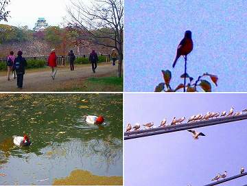 今日は、大阪城早朝探鳥会の日。探鳥後、大阪城公園をぶらぶらしてから帰宅し、午後は、老人ホームへ義母の見舞いに行った。探鳥会は7時に集合だが、6時半に家を出るときはまだ日が出ていない。途中で朝日が昇る。薄暗さが徐々に明るさに変り、森之宮に着く頃にはすっかり朝になっている。今日の参加者は10名。指導のM先生から、今日は運がいいとアイサという鴨が見られるかも知れないという挨拶で始まる。森に入るといろいろな小鳥の声が聞こえ、高い木の枝を飛び回っている。先生や他の仲間は、シロハラだ、アカハラだ、メジロだ、イカルだ、ツグミだ、カワラヒワだなどと言って双眼鏡を当てているが、私は、小鳥が飛んでいることだけはわかるが、双眼鏡を当てるともうそこにはいなくて、ほとんどはっきりした姿を見ることができない。場所を森から外堀に変えた。アトリという鳥をたくさん見ることができた。堀には、カワウ、キンクロハジロ、コガモ、カイツブリなどがいた。今日見た鳥は、前記のほか、ハクセキレイ、ヒヨドリ、スズメ、ハシブトガラス、ハシボソガラスの15種。このほか、帰り道で、ジョウビタキ、ホシハジロ、ユリカモメを見た。大阪城公園は、いたるところ紅葉がきれいで、鳥が見られなくても十分楽しめる。紅葉の写真はたくさん撮ったがその中から少し紹介する。大阪城 紅葉黄葉を 従へて