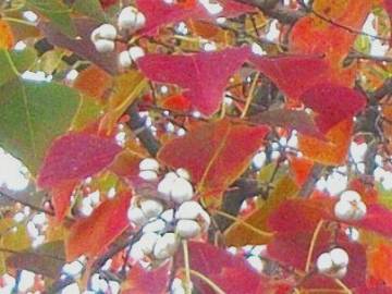 今日は、殆ど一日中在宅で過ごした。日経パソコンやパズル誌を詠んだり、OB会の資料を作ったり、年賀状の準備をしたり、いろいろ。今日の写真は、紅葉(もみじ)とともに、きれいな紅葉(こうよう)を見せているナンキンハゼ。葉とともにきれいなのが、白い実。夏に付けた青い実がだんだんと茶色から黒くなり、その黒い皮がはがれると中から3個の真っ白い実が現われる。たくさん実がついていると、まるで白い花が咲いているように見える。櫨の実の 白きが花の やうに見え