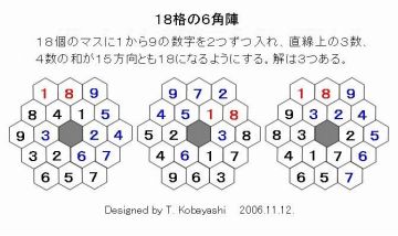 今日は、ほぼ一日中、昨日の句会のまとめを行った後、永井路子の「最澄を辿る」という本を読み始めた。句会のまとめは、句会で出句された全句について、選の結果、先生の評や添削、指導事項などをまとめるもので、以前は会員が10名程度だったのでよかったが、最近は20名近くになって来たので句数が増え時間がかかる。それでも、まとめをするといろいろ調べたりするので勉強にはなる。「最澄を辿る」は伝記のようなものだが、20年に一度の遣唐使にうまく選ばれたことや唐に渡るとき天候が悪く4艘の船のうち3艘は行方不明になったのに無事な船にたまたま乗り合わせ難を免れたことなどを知り、仏を信じることで何らかの力が与えられるのかと思った。今日の画像は写真がないので、一昨日作成した18格の6角陣を示す。有名な19格の6角陣は下記の形の中央を含む19個のマスに1から19までの数を1つずつ入れて、直線上の3数、4数、5数の和を全て38にするもので、解は1つだけある。下記は真中のマスに数字を入れないで18個のマスに1から9までの数を2回ずつ入れるようにした。3数、4数の和を全て18にするもので解は下記のように3つあった。冬紅葉 縦横斜め 魔方陣真中のマスに数を入れて、3数、4数、5数の和を全て19にする問題についても考えた。1から9までの数を2回ずつ、5だけ3回使うと出来、解は3つあった。来年は平成19年なので、これは年賀状のパズルに使おうと思っている。