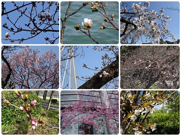 今日は、午前中は、昨日の句会のまとめを行い、昼前から妻に付き添って外食と買い物をし、その後、大川沿いを散歩した。桜は全体的には1-2分咲きくらいで、8分咲きに近いような木もあった。まだ一輪も開花していない木はなかった。写真は、今日撮ったいろいろな桜。