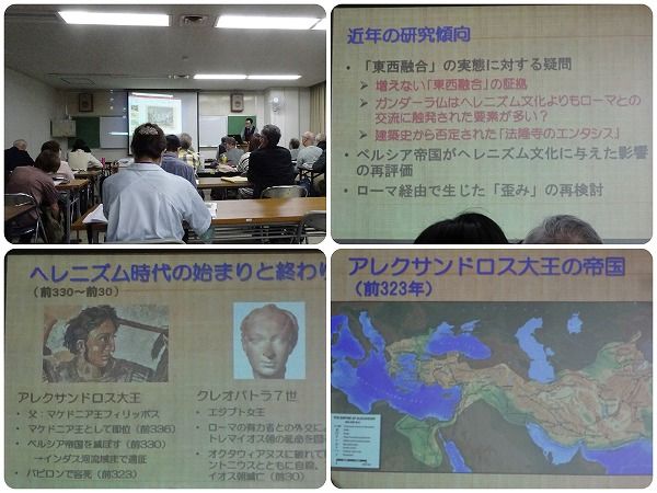 今日は、高大6日目、午前中は、柴田広志先生の「地中海世界」の講義、午後は、クラスミーティングだった。講義は、紀元全4世紀から紀元後1世紀くらいまでの地中海世界の歴史で、その前半では、ローマからインドまで広大な領域を征服したアレキサンドロス大王の話、後半は、大王が33歳で亡くなった後、「後継者」と称して、その領土内で活躍した「三大王国」、アンティゴノス朝、プトレマイオス朝、セレウコス朝の話であった。写真は、授業の模様。クラス・ミーティングでは、班の研究課題について話し合った。テーマは一応「イスラム教の歴史」にきまり、小テーマとその分担については、次回決めることになった。帰宅の途中で、歴史博物館に立ち寄って、難波宮の展示を見た。写真は、左上から、難波宮公園全景、古代の応急の変遷図、難波宮全体図、難波宮説明文、前期難波宮(7C)、飛鳥宮(7C)、藤原宮(7-8C)、平城宮(8C)、後期難波宮(8C)
