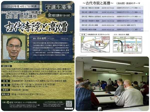 今日から、シニアシティカレッジの歴史講座が始まった。本来は4月からの開校だったが、コロナのため6か月遅れてのスタートとなった。毎月1回、6か月のコースで、講師は若井先生、テーマは「古代寺院と高僧」。今日は、その第1回目で、「飛鳥寺と旻法師」という題で講義を受けた。写真は、受講案内と、講義の模様。古代史は、昨年一年間高大で勉強し、飛鳥寺も建立も僧旻についても習ったはずなのに、忘れていたことが多く、今日の講義は全く新鮮に感じられた。講義のあと受講の仲間とランチをしたあと解散した。帰宅後は、講義内容の復讐をしたり、テレビを見たりしながら過ごした。