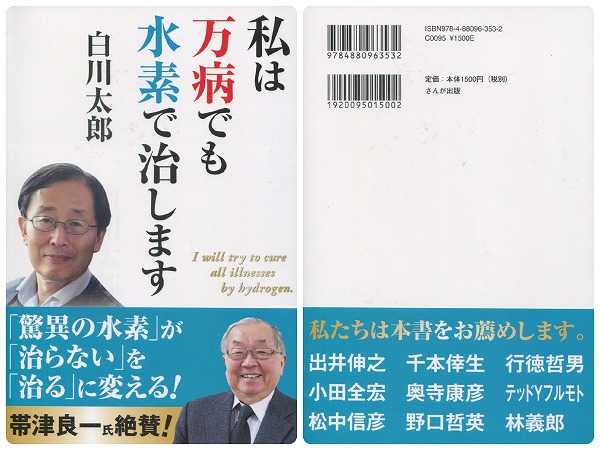 今日は、午前中は、昨日のいきいき俳句会の句会報を作成・印刷・製本・封入・郵送までを行い、午後は、明日の句会のための俳句作りをしたあと、知人から借りた白川太郎の本「私は万病でも水素で治します」を読んだ。世の中に、水素水とか水素カプセルなるものが、健康にいいということで出回っていることは知っていた。知人は、その水素カプセルのPR動画を見て、本を購入し、「共感を覚えたので、読んでみないか?」と勧められたのである。読んでみた感想は、まんざらインチキではないが、さりとて100%の信頼は置けない。なぜなら、水素カプセルが万病に効くのであれば、なぜ、医学上の表彰を受けていないのか、病院や薬局で扱う薬品になっていないのかという点だ。それについて、本では何も書かれていないのだ。ただ、成功例ばかり多数掲載しているだけなのだ。学術的な説明はこうだ。万病のもとは活性酸素による身体の重要細胞の破壊。病状を取り去るには活性酸素を取り除けばよい。それには、活性水素を作用させればよい。これはその通りだと思う。水素は、粉末にしたゼオライトに吸着させカプセルに封入されている。これを服用すればやがて水素が溶け出し、身体中にまわり、活性酸素が作られると直ちに反応して水になってしまい。細胞の破壊は防げるといっている。作られる活性酸素がどのくらいあり、水素がどれくらい溶け込んでいるのかという定量的なデータは何も示されていないのが、不安である。カプセルの価格は1錠200円弱で、症状に応じて一日、1~10錠を服用するのだそうだ。通常の薬局では売られてなくて、通信販売でしか買えないのも不便である。写真は、本の表紙と裏表紙。