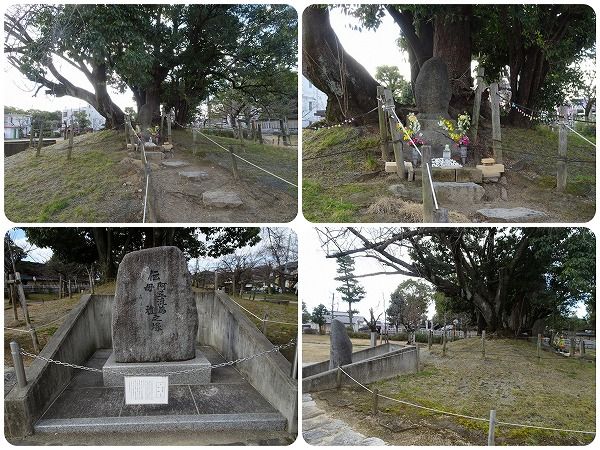写真は、片埜神社の北側の公園にある阿弖流為、母礼の首塚。楠と桜の老木の根元に祭られていて、左側には別に立派な碑が建てられている。