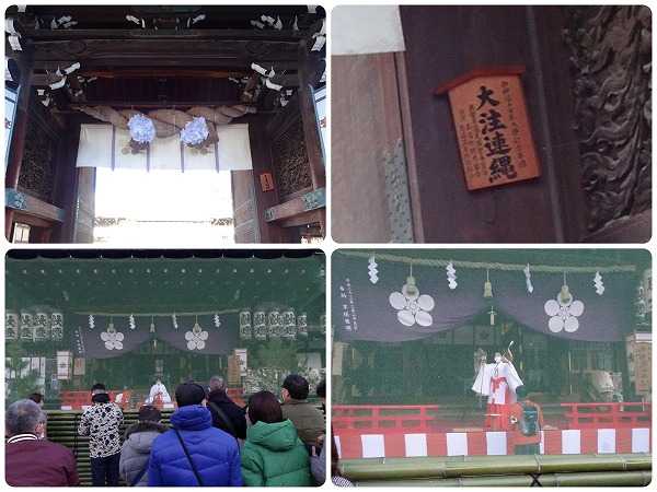 初詣は大阪天満宮へ行った。例年の如く、古いお札や破魔矢を返納し、新しいものをいただいて帰った。写真は、南門のお大注連縄と拝殿での神楽。