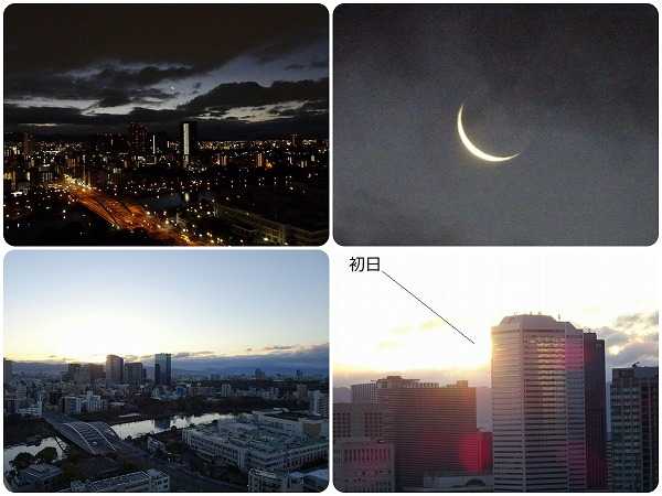 次いで、マンションのベランダから見た初日の出。残念ながらちょうど日の出の時刻、東の空低く厚い雲がかかっていて、実際に太陽が覗いたのは日の出時刻から10分ほど経ってからであった。日の出までは29日月が浮かんでいた。上は6時30分、下は7時20分。