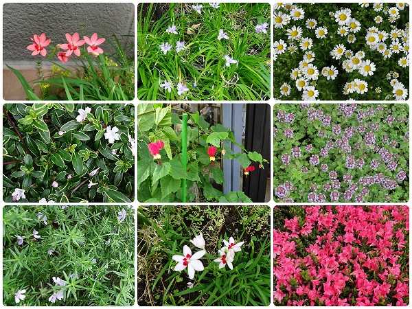 下の写真は、自宅からスーパーまでの道路脇で見かけたもの。ハナニラ、ヒメシャガ、ノースボール、ツゲ、フクシャ、タイム、ローズマリー、ハナニラ、ツツジ。