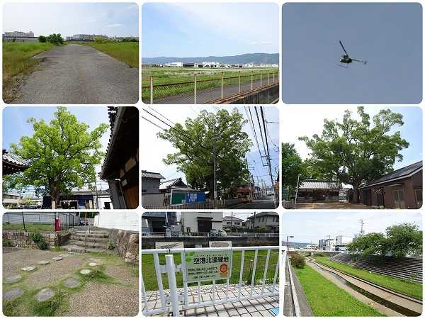 陸軍飛行場跡、現八尾飛行場、ヘリコプター、楠本神社の楠、南の楠本神社の楠、北の楠本神社の楠、平野川の船着き場、空港北濠緑地、同。