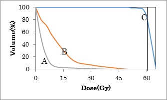 横軸は線量(Gy)です。この例の場合60Gy照射しようとしています。縦軸はその臓器全体の体積のうち何%被曝しているかを示します。 がんの部位のターゲットは、Cのように右上に行くほどよい計画となります。この例の場合60Gy照射されるターゲットの体積は85%です。 AとBは、正常組織の照射を示します。正常組織はなるべく照射されないように計画をたてますが、どうしても少しは照射されます。たとえばAの場合10Gy照射される臓器の体積は5%、 20Gy照射される臓器の体積は2%となります。Bの計画では、20Gy照射される臓器の体積は15%ですので、正常組織はなるべく左下Aの形になっているほうがいいことがわかります。