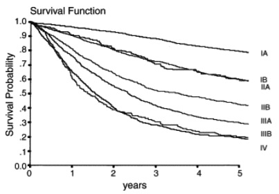 肺がんという病気は、恐ろしいものである。全国のがんセンターの生存率がインターネットで公表されているが( http://www.gunma-cc.jp/sarukihan/seizonritu/comment.html )、下図の1996年の全国がん集計6644例の肺がん術後病理病期別生存曲線を見ても、かなり悲観的になる。グラフをよく見ると、3期や4期でも20〜30%は、5年生存しているんだから、あきらめずに治療することも大事かなと思うので、ちょっと思いつくことを書き綴ってみようと思う。 このグラフは生存率曲線で、横軸は経過年数、縦軸は生存者の割合となっている。がんの治療成績を示す指標の一つです。たとえば1A期は、3年目の生存率は90%ということが読み取れるけど、患者さん個人の生存の期待値が3年目で90%というのとはちょっと違う。この病期では、2000人の例数があるけどその90%1800人が、3年目で生き残ってるということ。このグラフはたぶん、Overall Survivalだと思うので、交通事故で亡くなっても、がんで亡くなってもパーセントは下がるので、まあ長生きできそうだなと読めます。 ただ、3期をすぎると悲惨になってきて、3A期では、3年目での生存率は40%、3B期と4期は3年目での生存率は30%となります。病期と進行具合は別の機会に書くとして、1期は人間ドックや健康診断で見つかるのみなので、自覚症状が出て病院に罹った時には、だいたい3期か4期かなと思います。 それでも、3A期の5年生存率は30%もあるんだから、100人同じ病期になったとして30人も生き残ってるということは、希望があると楽観的に見れないこともないようにおもう。