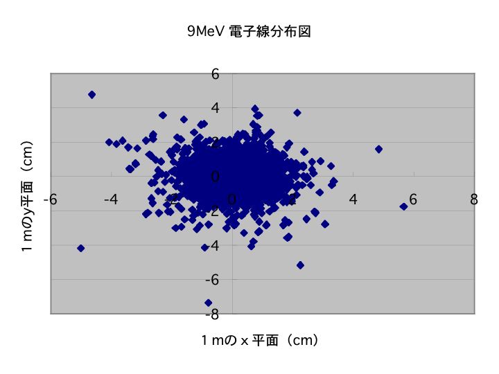 9MeVの電子線のシュミレーション コードを作りました。スキャッタリングホイルに、9MeVの単一エネルギーの電子をぶつけて1mの点での 平面の分布をグラフにしました。なんか、それらしい分布になったような気がするのですがこのあと、PDDを計算します。出来上がったら、また書き込みます。