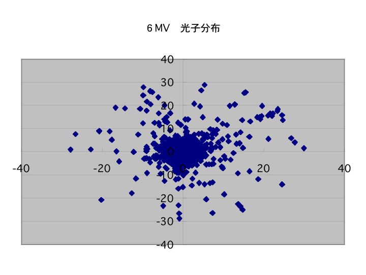 12月2日に阪大で関西EGS4講習会があった。6MVの電子をターゲットのぶつけて、1m 離れた平面での光子の分布を計算するという、簡単なシュミレーションをした。上の図がその光子をプロットしたものです。フラットニングフィルタがないので、中心に光子が集中しているのが分かる。この後、フィルタを作ったり、コリメータを作ったりして、精度を上げていかなきゃと、おもっとります
