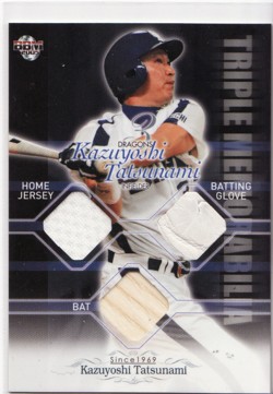 新潟カードショウ惨敗といいつつ、一応めずらしいらしいカードと言われたのでこんなの引いたのでご紹介します。(ネタがないので、掘り出してみました。) 立浪トリプルメモラ。実ははじめて開けました。まあ、最初で最後ですが・・・・。バッティンググローブが白単一ですが、かなり厚みのある部分なのでなかなかいい感触です。もう1枚は ノーマルのバッティンググローブカード。あとは何もありません。めぼしいものは出ませんでした。ちなみに両方とも提供可です。