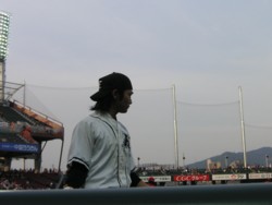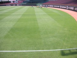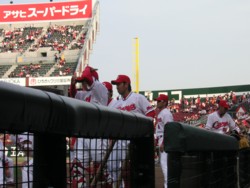 とにかく圧倒されました。ベンチよりもホームベースが近い。そしてすごい臨場感。左側を見ると審判室とあるんですが、その前にホームランガールがたっていたりします。こんな風に。そしてバックネット裏はこんな感じです。 電光掲示板ができてました。ちょっとマリンスタジアムみたいです。で、右を見ると、1塁ベンチが丸見え。これは楽しいぞ。 こんな感じで見えます。うーん。こんなに近くで見れるなんて嬉しすぎるぞ。おや、選手が出てきた!一番乗りは琢朗さんだ~。 マーティーもでてきたぞ。 どんどん選手たちもでてきました。またG軍のバッティング練習中のためグラウンドにはでれませんが。 近い、近いよ。高コーチが現れたので、思い切って声をかけました。我々 「高コーチ、高コーチ」高コーチ「何???」我々 「写真取らせてください」高コーチ「え、俺?」と快く返事をいただきました。それがこちら。 こんなことをしていたら、あっという間にG軍の練習が終わり、カープの練習に変わろうとしていました。