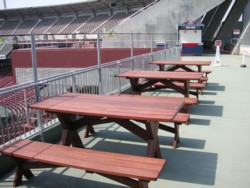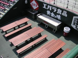 レフトパフォーマンスシートから2階通路でつづく内野自由席方面へ。ゲートの上に2階結ぶ通路。そうゲートブリッジ。このゲートブリッジには12球団の球場で唯一のシートがあります。それが ゲートブリッジ席1テーブル ¥21,000 で6名までOKちなみにフード付だと¥25,000です。フードについてくるポップコーンがキャラメルポップコーン。これが球場で普通に売ってますが、かなり美味しいです。是非、球場に来られた方は食べられてみては。。。通路にテーブル置くなんてナイスアイデア。いいですね。ここからでもばっちり観戦できます。こんな感じ。 しっかり座ってグラウンドの見える感触を確かめました。柵が低いので、邪魔にならず上からの観戦ですが、東京ドームのような圧迫感や遠い感じはまったくありません。仲間と集まってこのシートで観戦してみたいと思いますね。さて、ゲートブリッジを通って、正面の2階内野自由席とコカシートの所へ。コカシートとはコカコーラシートという名称の席です。略してコカシート。2階の正面1塁側・3塁側、1塁側、3塁側の4箇所あります。ここも1テーブルで。1テーブル ¥20,000 5人までOK。フード付¥24,000こんな感じです。コカコーラーシート 1人掛け席2つとコカコーラの宣伝テーブル1つ、ベンチが1つという構成です。前のネットが安全のためありますが、まあそれほど邪魔にはなりません。ここは是非家族や仲間で持ち込みで来たいですね。このコカコーラーシートの後ろは内野自由です。内野自由席 うーん。広いぞ。内野自由席ここから1塁側も赤いシートはみんな自由席。2階メインにするとはちょっと2階の眺めと内野自由に圧倒されました。