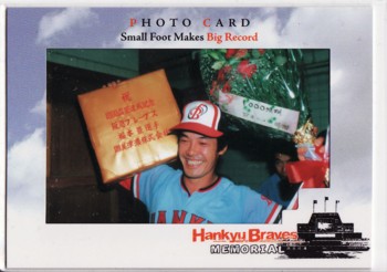 フラフラと街を散歩しつつ、本屋に立ち寄るとそこには人気のあの箱が・・・。ちまたは大人気で売り切れの阪急セット。思わずお買い上げしてしまいました。全部で5つ。うーん。買ってしまいましたね。お持ち帰りで、さっそく開封。1箱目。あ、厚い。これが噂の厚紙入り。2枚直筆ですね。まずは1枚目 【阪急セット 白石直筆(横)】(マイコレ)2枚目おお、縦だ。し、しかもあなたは。 【阪急セット ブーマー直筆(縦)】(提供可能)1箱目から嬉しい引きです。2箱目おおお。またまた厚紙。2枚入りだ。1枚目は?【阪急セット 住友直筆(横)】(提供済み)(画像なし)2枚目 【阪急セット 福良直筆(縦)】(提供済み)連続で縦を引けるとは。3箱目へ?厚紙ですか?1枚目【阪急セット 岡村直筆(横)】(提供済み)(画像なし)2枚目 【阪急セット 石嶺直筆(縦)】(提供済み)3連続2枚入りで縦3枚とは。何も考えて無いときはいい当たりです。4箱目薄紙が見えますね。フォトです。 【阪急セット 上田監督執念の~】(提供可能)2枚目 【阪急セット 山森直筆(横)】(提供可能)5箱目ラストは厚紙ちゃんが。みえます。有終の美は2枚入り。1枚目 【阪急セット 岩本直筆(横)】(提供済み)2枚目 【阪急セット 星野直筆(縦)】(提供済み)おお。遅球の達人、星野選手。これは嬉しいな。5BOXも追加しましたが、終わってみれば、縦4枚、横5枚という大当たり。いや、久しぶりに大満足な結果です。欲が絡まないといい結果です。これが欲しいカードが入っているシリーズだと・・・・・・・・・・・・。楽しい開封でした。