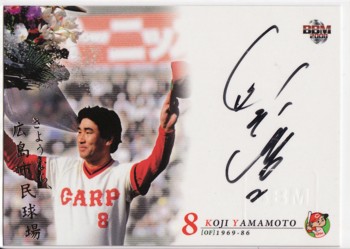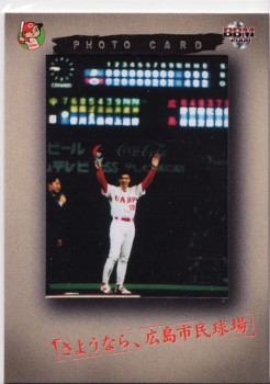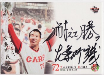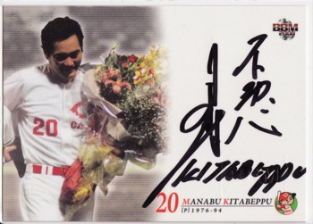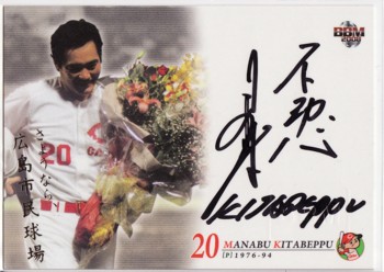 カープの精密機械、ミスターコントロールといえばこの方しかいません。本当に素晴らしいコントロールでコーナーを投げわけます。そうこの方。 【さようなら、広島市民球場 北別府直筆】ヒスコレとは少し違っていい感じです。カード自体のデザインもいいですが、ローマ字が入っているのもいいです。デザインを含め、このシリーズで気に入っているカードの1枚です。