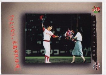 もうお店に本屋に広島セットが無くなってきてまだまだ開けたらない所・・・・。中学時代からの友人が連絡をくれました。友人「お前、カープファンだろ?」俺 「そうだよ。」友人「うちの近くカープのカードおいてるぞ、いるか???」俺 「まじーーー。さようなら、広島市民球場ってやつだよね」友人「そうだよ。8こくらいあったぞ。」俺 「頼むー全部買っておいてくれ。」ということで、友人が行ってくれたときには5つになっていたそうでそれを全部買ってきてもらいました。前回の幸運が続いてくれーと祈りつつ、1BOX目さっそく出てくれました。赤いのが。 【さようなら、広島市民球場 山本浩二箔版直筆】おおおおお、いきなりですか浩二さん~いい感じです。2BOX目キラキラしてますね。 【さようなら、広島市民球場 江夏100シリ】抜けのシリアル。よしよし。3BOX目おやおや、またまたキラキラしてるーーー。 【さようなら、広島市民球場 津田100シリ】思い入れ深い津田さん。シリアルの中では一番欲しかったカード。自引きできるとはうれしいな。4BOX目き、きたー。赤いの。【さようなら、広島市民球場 山本一義箔版直筆】抜けでしかも箔版。山本さんのカードは渋いなー。いやいや抜け埋まるのはうれしいぞ。5BOX目あ・厚い?ついに2枚目のメモラか?あ。この裏の絵は。 【さようなら、広島市民球場 山本浩二フォト】数すくないフォト。これも抜けでしっかりと抜けが埋まりました。いい箱を選んできてくれた友人に感謝。