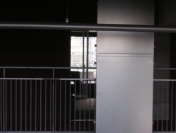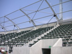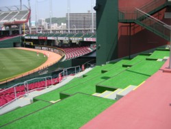 最初に案内されたのは外野席。というよりレフトパフォーマンス席。ビジターパフォーマンスシートは¥1,800。アウェーの応援席になります。ここにはルールがあってアウェー側でカープユニを着て応援は禁止。逆にライトパフォーマンス席ではアウェーのチームのユニフォームを着て応援することは禁止。これは球場のルールとして明確にされてます。もしそのような行為をした方は球場係員に注意されます。注意されても治らない方は、つまみ出されます。この席で観戦される方は注意してくださいね。階段を昇って、席側に行くと、いい眺め。でもちょっと高いね。でもここは本当に見晴らしがいいぞー。席はこんな感じです。レフトパフォーマンス席 席の上にあるのは網です。ジェット風船が外に飛んでいかない為用です。そしてこの高さからバックスクリーン側を見ると レフトポールがすぐそこだ。 バックスクリーンがよく見えるねー。 正面見ると、1塁側の2階席。バックネット側は、赤いシートの下に緑のシートの出っ張った部分があります。ここはスカイシート。スカイシートは正面1塁寄り・3塁寄り、1塁側の3箇所。1席¥3,000 近くの3塁側は 2階席もよく見える。そしてこのマツダスタジアムパフォーマンス席にはここだけしかないスペースがあります。それがここ。 さてここは何のスペースでしょう正解は応援団専用スペースここは応援団しか使用できないスペースです。ここで旗を振ったり、トランペットや掛け声をかける人などが使います。ちなみに全国の私設応援団連盟に加入していないと使えません。パフォーマンス席を堪能して次の場所へ。移動の途中にパフォーマンス席の裏側から外の景色を1枚。 レフト側は線路側なので広島駅からのびる線路がよく見えます。これがあるからレフトパフォーマンス席の上に網があるんですね。